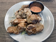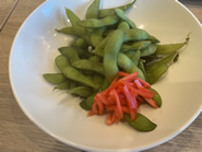 枝豆は塩、またはガーリック味の二種類 のフレーバーがあります 薄い衣のついた豚の唐揚は薄味なのでオーロラソースをつけていただきます