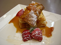 手作りの甘さ控えめカスタード&生クリームと、サクサクと何層にも重なったパイの軽い食感は、食事の後でもペロリ。いちごがたっぷり入っていて、ほろ苦いカラメルにはレモンが絞られているので、さっぱりした口当たりが新鮮です。
