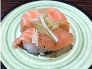 ガーリックの風味が食欲をそそるGarlic Ponzu Tuna 日本のクラ寿司でも大人気の石澤ドレッシングを使ったIshizawa Seared Marinated Salmon Seared Shrimp with Yuzu Salt。炙ったエビにユズの風味が爽やか