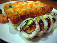 テーブル席につくと、メニューと同時にピンク色のオーダー・リストを何枚か渡されます。そのオーダー・リストにのっているものは全て食べ放題の対象メニューで、飲み物とその他のメニューに関しては追加料金がかかるという仕組みです。用紙は何度でももらえて食べたい分ずつ頼めるので、一度に注文する必要はありません。ひとまず、そのリストに載っている11種類のアペタイザーから、Miso SoupとHome Salad、Gyouza、Shumai、Yaki chiken(胸肉の焼き鳥)、Edamame、Tempura、Tatsuta age(唐揚げ)、それにHarumakiを頼みました。それぞれの料理はそれぞれのポーションが小さいので、居酒屋感覚で少しずつつまめるのが嬉しいです。また家庭的な味つけで食べやすく、中でもぎょうざと竜田揚げは取材班に好評でした。続いてメインの寿司メニューからは、15種類ある握りよりTunaとWhite tuna、Red snapper、White fish、Mackerel、Eel、Octopus、Tofu skin、Squid、Masagoを注文してみました。全体的にシャリが少し多いようではありますが、各ネタは新鮮で艶もよくサイズも手頃な感じです。中でも品のある味つけのウナギは身がフンワリ、イカもトロっとした食感と甘みがあってお勧めです。ロールメニューはユニークなネーミングがついたものが30種類ほどもあり、どれにするか迷いましたが、SapporoとPalatine、 American Dream、Christmas、Mountainの5種類をトライしてみました。このうち一番の好評だったパラタイン・ロールは、サーモンやうなぎ、キュウリ、とびこ、アボカドと特に変わった具材の組み合わせではないのですが、程よく脂ののったサーモンやトビコのプチプチ感、うなぎのタレが見事にマッチしています。アメリカンドリームは先ほどのパラタイン・ロールにはいっているサーモンがエビフライに変わっただけなのですが、このエビフライのクランチーな食感が好ポイントとなり2番人気でした。マウンテンロールは、上にかかっている特製のスパイシーマヨソースがアクセントに効いていて、これまた違った味わいが楽しめます。どのロールもボリュームがあって見た目が綺麗なうえ、それぞれの具材の味をバランス良く活かして巻いてあるので、大勢でシェアしながら食べると会話も一段と弾みそうです。
