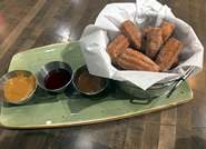 最後に、デザートとしてChurrosとCheesecake Taquitos(スペシャルで、定番メニューではありません)を注文しました。シナモンシュガーをまぶしたチュロスは甘すぎず、サクッとふんわりした食感が魅力。塩キャラメルソース、ベリープリザーブ、バニラビーンソースの3種類が付いてお得感もあり、取材班に大好評でした。ちなみにキッズメニューを注文すると、追加料金でチュロスサンデーを頼むことができます。デザート版タキトスは、濃厚なチーズケーキペーストを包んで揚げた一品で、カリッとした表面が心地よく、熱々のうちに食べるのがおすすめです。