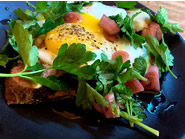 このお店ではShared Plates(色んな料理をシェアして食べる)をコンセプトに、ギリシャ料理と中東料理を融合させた多様なメニューを揃えており、小皿や大皿で色々と試せるのが魅力です。今回は日曜日のブランチに訪れて、Small PlatesからWerp Farm Greens With Ubriacone Cheese、Pear、Marcona Almond and Cabernet Vinaigrette とButcher's Steak with Fired Egg, Charred Pumpkin, Pickled Shallotsを頼みました。ファームグリーンズは、ザックリと大き目に切ったレタスや葉野菜の上にローストしたアーモンドやチーズをトッピングしたサラダで、シャッキと新鮮な野菜にアーモンドの歯ごたえやハーブの爽やかさ、それに塩加減が絶妙です。また、洋ナシとドレッシングの甘みがさらに味の奥行を出していて、シンプルながらも印象に残る一品でした。炭火で焼いたカボチャにステーキと目玉焼きをのせたブッチャーズステーキは、焼き加減バッチリのお肉がとっても柔らかく、酢漬けにしたエシャロットやイタリアンパセリがしっくりと合います。食べ応えのあるステーキにカボチャの甘味が意外に合っていて、朝から栄養もエネルギーもしっかり取れそうと取材班内でも好評でした。