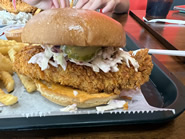 チキンサンドイッチ(マイルド)は、ほんのりと辛味があり、ソースは必要ないくらいでした バンズからはみ出す大きさで、ボリュームもたっぷり!