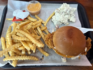 フライドチキンの辛さは、スパイスのないプレーンからスーパーホットまでの5段階から選べるようになっており、今回はチキンテンダーをプレーンで、チキンサンドイッチをマイルドで注文しました。チキンテンダーはとても大きくて、外はカリカリ、中はジューシー。辛さのないプレーンを選んだので、味は控えめですが、特製のソースが絶妙にマッチします。付いてくる24Kソースは、マヨネーズとケチャップを合わせたものにスパイスを加えたような味わいで、食欲をそそる一品。マイルドで頼んだチキンサンドイッチのチキンは、ほんのりとした辛味があるので、こちらは逆にソースは必要ないくらいでした。サンドイッチのチキンも外側が非常にカリカリで、中がジュワっと肉汁溢れる仕上がりで、一緒に挟んであるピクルスとコールスローが良いアクセントになっています。ボリュームもたっぷりで、食べ応え満点でした。ちなみに24Kソースのネーミングは、金の純度を表す24カラットに由来しており、最高峰のソースという意味が込められているそうです。サイドには皮つきレッドポテトを使ったポテトサラダを選びましたが、これが素朴な味わいで、なかなか美味しかったです。サイドアイテムにはこの他に、マック&チーズやビーンズなどがあります。