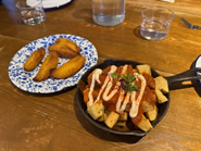 フライドポテトに辛いソースとクリーミーなガーリックアイオリを添えたPatatas Bravas(右)と、プランティーンをカラメル状になるまで揚げたMaduros(左)