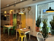 シカゴ市内のLakeview地区にあるキューバンカフェ「Cubaneo」に行ってきました。真っ白な外壁にダークグリーンで描かれた店名だけのシンプルな外観ですが、大きな全面窓からはカラフルな椅子や南国風のランプシェード、さまざまな観葉植物がのぞき、思わず足を止めたくなる洒落たデコレーションに目を奪われます。店内に入ると、片側一面に設けられた長いベンチ席に、トロピカル柄のクッションがきれいに並べられ、空間に彩りを添えています。パステルカラーに塗装されたクラシカルなドアや、微妙に色や装飾の異なるカウボーイハット(テンガロンハット)が壁に飾られているのも印象的で、キューバのネオクラシックな雰囲気が随所にちりばめられた、明るく陽気な空間が広がっています。さらに、BGMにはサルサを中心としたラテン音楽が流れ、より一層エキゾチックなキューバンルーツを感じることができました。