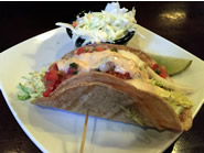 そんなビールに合わせたアペタイザーのメニューには、Small Bitesという2人用のプレートもあり、タパスや日本の居酒屋感覚で色んなものを少しずつ楽しめるのも嬉しい点です。そのSmall BitesからBlue Cheese & Bacon Potato ChipsとTavern Taco(Cod)、そしてレギュラー・アペタイザーのメニューからBrewmaster Platterの3品を注文しました。カラッと揚がったホームメイドのチップスにはベーコンビッツとジワッと溶けたブルーチーズがのっており、かなり塩気が強いので、一緒についてくるクリーム・ホースラディッシュのディップソースはつけなくても十分なほどでした。フライドコッド入りのタコスはドレッシングが予想以上にスパイシーですが、淡泊な白身魚との相性はよくビールが進みます。ブリューマスター・プラッターも数種類のチーズやサラミ、生ハム、パン、それにフルーツがお皿一杯に盛られていて、これまたお酒によく合いました。