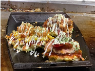 本場の味に負けないなかなか本格的な大阪風お好み焼き(タコ) 野菜と焼きそばを薄焼き卵のような薄い生地で挟んで焼いた広島風お好み焼き(豚) 3種類(エビ、豚ソーセージ、タコ)のミニサイズのお好み焼きを食べ比べ出来る、お好み焼きフライヤー