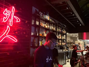 お店の外壁にはカラフルな鎧を着た大きなサムライの絵が派手に描かれており、遠目からみてもインパクトがあります。その反面、店内は黒ですっきりとまとめられており、入口のそばに掲げられた「外人」と書かれたピンクのネオンサインがレトロな印象。テーブル席には日本のお好み焼き店のように鉄板がついていて、焼きたてのお好み焼きを温かいまま頂くことができます。また、カウンター席では目の前のガラス越しに、シェフがお好み焼きを作る様子を見ることができます。今回は活気のあるカウンターでいただいたのですが、シートが日本の飲食店でよく見かけるような座席部分を開くと荷物を入れられるタイプになっているので、上着やかばんなどの荷物を気にせず、快適に食事ができました。