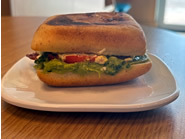 フォカッチャにベーコン、スクランブルエッグ、フェタチーズ、ミニトマト、アボカド、オニオンジャム、ペストアイオリを挟んだサンドイッチ。甘味・塩味・酸味のバランスが絶妙で、特にセイボリーなオニオンジャムと、まろやかなペストアイオリがアクセントに効いています。栄養バランスもよく、しっかりと朝食を摂りたい方におすすめです。