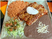 メインにはエンチラーダとコンビネーションプラッターを注文しました。どちらもサイドにリフライドビーンズや野菜、メキシカンライスがついており、コンビネーションは、タコスとエンチラーダ、ブリトーがセットになっています。トマトベースのタコソースやエンチラーダソースはさっぱりとした軽い味付けで、量も多すぎず少なすぎずちょうどよい感じでした。ソースは比較的マイルドなので、辛さのパンチが欲しい方はテーブルサービスのスパイシーサルサを足してみるのもお勧めです。エンチラーダやタコスは具をビーフやチキン、チーズまたは、ミックスから選べます。