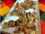 材料をのせたカートをテーブルまで運んできて、目の前で作ってくれるワカモレ 出来あがたったワカモレはお皿の形に揚げたトルティヤ生地にのせてくれます 薄く敷いたチップスとビーンズの上にチーズや野菜をパラリとかけた上品なナチョス