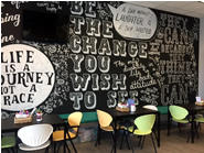 21種類のビタミンやミネラルをブレンドして焼いたチョコレート・チップクッキー。 ポップで明るいデザインや色使いのインテリア。 ブラックボードには力強いスローガンが書かれています。