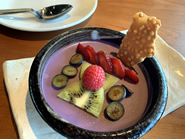 デザートにはウベという紫芋を使ったUbe Pot de Cremeをオーダー。ドキッとしてしまうような淡いパープル色のクリームブリュレはイチゴやキウイ、ラズベリー、ブドウなどで彩り良く飾り付けされており、美しい色のコントラストが見事です。味のほうもスムーズな舌触りと程よい甘さですっかり虜になる美味しさで、取材班の間で取り合いになってしまうほどでした。