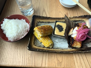 ランチ時間に訪れたので、今回はメインアイテムにサラダとキムチ餃子がついてくるランチセットをトライ。ランチセットはいくつかメニューがあるのですが、チラシのセットと銀鱈の西京焼きに柚子みそと赤玉ねぎのピクルス添えのセット、クランチースパイシーツナの巻物×サーモンアボカドの巻物×にぎりの2巻がついたセットの3つを頼みました。食事の最初にでてくるサラダはまろやかな和風ドレッシングが優しい味わいで、焼き立て熱々のキムチ餃子は皮がカリッと香ばしく、中の餡はキムチの味が強すぎず、食べた後にフワッと香りが追いかけてくるのが印象的。早速ビールがすすみます。