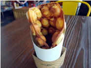 最後はSnacksメニューにあるBubble Waffle Cheeseを頼みました。たこ焼き器のようなボコボコとした面白い型で焼いたワッフルで、アジア系のカフェで大人気のメニューです。外はカリッと軽く中はフワッと柔らかく、甘さは控えめで、生地には濃厚なクリームチーズを練りこんでいるので、チーズの酸味とコクがクセになる美味しさです。
