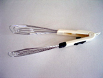 キッチンアイテム2つ目は、この「ちょっとかわったフライ返し」。何が変わっているかというと、ボタンを外すと、フライ返しの部分が2枚になっていて、いろんなものをつかめるようになっていて、それだけの違いが、お料理をらく〜にしてくれるんです。例えば餃子を焼くときなど、うまくきれいに焼き色が付くように返したいですよね。このフライ返しなら、はさみのように押さえながら4、5個一緒に返せるのでとてもプロフェッショナルな出来映えになりますよ。それとゆであがったスパゲッティ。普通ならお鍋ごとざるにあげて、ヨイコラショって感じですが、このフライ返しを使えば、スパゲティを水切りしながらそのままつかむ事ができ、そのままパスタソースの出来上がっているフライパンへひょいっと入れてあえればはいできあがり。スクランブルエッグの時なんて、これで卵をとく事が出来るし、もちろんフライ返しとしても使えるので一石二鳥です。そしてもちろんデイッシュウッシャーセーフ、なんで面倒な手間なくきれいになりますね。