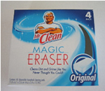 まずはこのマジックイレーサー!ほんとに魔法のようなのですよ、これが。キッチンをぐるりと見回すと、ディッシュ・ウォッシャーや炊飯器など「白い家電」って多いですよね。けれど毎日使うものだから、冷蔵庫の取手の部分が手垢で黒くなったり、電子レンジの部分にラザニヤだかミートソースだか、とにかくイタリアンな赤っぽい色がこびり付いていて、もうマンマミーア状態。そんな時に大活躍するのがこれ「魔法の消しゴム」なんです。箱をあけると4つ白いスポンジ(お豆腐のようです)が入っていて、それを水に浸してから軽くしぼって、白く戻したい部分をゴシゴシと消すというもの。そう、まさに「消しゴム」の要領で。するとどうでしょう、まぁピカピカきれいになっちゃった!白い壁だってまかせてください。子供さんにクレヨンで書かれたテレタビーの絵や、いすや机を動かしたときに出来てしまった黒い線、などもこれでばっちり消えてくれるのでした。残念ながらこれ使い切りタイプ。ゴシゴシこすっていくと、消しゴムの形はなくなっていき、薄汚れてきて、ぽろぽろとカスになっちゃいます。「がんばってくれたねぇ、うんうん、もう十分よ」と話しかけつつゴミ箱にポイ。よーく見てみると、消しゴム一つ一つに「王様と私」の王様、ユル・ブリンナーのような絵が浮き出ている、、、いえいえ、実は彼の名はMr.Clean、白いシャツに白いまゆげのおじさんロゴマークらしいです。なんと実物も存在し、セレブリティーとしてパーティーに参加したり、ファンドレイザーで活躍したり、とお忙しそうです。ちゃんとお掃除する時間あるのかしらねぇ。