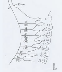 例えば、首の真後ろを指で触ると、特に首の下の方は出っ張っていて骨がすぐ皮膚の下にあるような感じがしますが、実際にはどうなのかご存知ですか。図1は首を横から撮影したX線写真を紙に転写し、皮膚から骨の先端までの距離を測ったものです。