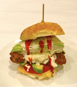 ハンバーガーなどについてくる野菜って、レタス、トマトが1枚ずつちょこんとある程度で、寂しい見た目。しかし、とあるレストランでドカンと野菜が盛られたサンドイッチを食べて、今回のレシピがひらめきました。鶏肉は胸肉よりもモモ肉が味があって美味しいです。野菜の嫌いな子供でも、見た目のインパクトで結構食べてしまうものです。