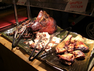 先輩「勿論豚の丸焼きのこと。お祝いの時なんかの料理だね。さすがにバフェでは丸焼きは置いてないけど、くし焼きになったBBQはポークとチキンが用意されているよ。ほら、あそこにド〜ンと豚の頭が置いてあるテーブルにちょうど今焼きたてのが出てきたね。」