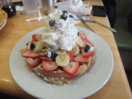 Dream Pancakesってのもオーダーしておいたんだけど、こっちはパンケーキの中にブラックベリーが練りこまれているもので、その酸味がお気に入りなんだ。添えられているのは、ラズベリーソースとオレンジの香りがさわやかなバター、それから生クリーム。自分の好みでいろんな味が楽しめるのも楽しいよね。