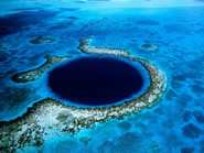 もう一つベリーズの見所といえば、ブルーホール。写真で見る事は多くてもどこにあるか知らない人も多いようです。ベリーズ本土から約100キロ東にライトハウスリーフの中に一際、深青い色をした穴があります。直径300メートル以上、深さ130メートル、周辺は珊瑚で囲まれています。ブルーホールへはセスナ機で上空からお楽しみいただくか、ボードで行く事ができます。野生イルカも生息しておりダイビングを一緒に楽しむ事もできます。