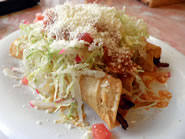 トルティーヤでクルッと巻いて揚げたタキートスは、上に乗ったレタスやトマトなどの野菜のシャキシャキ感と、トルティーヤのパリパリっとした歯ざわり、そして中に詰まったジューシーで甘味のあるチキンとタマネギの絶妙な組み合わせがたまりません。おいしい上に小ぶりなミニサイズなので、あっという間に平らげてしまいました。 |