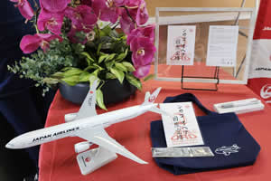 搭乗が始まると、初便を記念して、オリジナルデザインの「御翔印」をはじめ、トートバッグ、ボールペン、トラベルタグなどの記念品が乗客一人ひとりに手渡されました。その後、JL55便はJALスタッフに見送られながら予定通り午後12時30分に出発し、12時間42分のフライトを経て、成田空港の63番ゲートに予定より少し早く到着したとのことです。