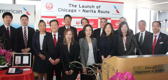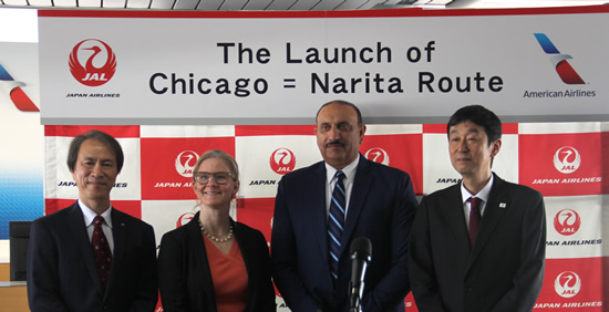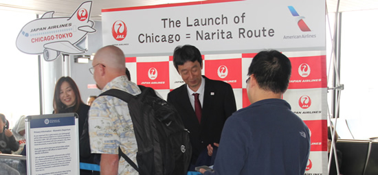 6月1日、晴天に恵まれた午前10時過ぎ、シカゴ・オヘア空港第3ターミナルのK19ゲートに、真っ白でエレガントなJALのボーイング777-300ER型機が姿を現しました。通常であれば羽田行きのJL9便として出発するこの便ですが、JALはこの日から昼間は成田便、深夜には羽田便の2便体制で運航することになりました。