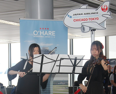 この日は初便を記念し、K19ゲートにてセレモニーが開催されました。大学生の祖父江瑠夏さんと地元の高校に通う長屋陽音さんによる爽やかなバイオリン・アンサンブルで幕を開け、続いてシカゴ航空局のチーフコマーシャルオフィサーのアンバー・リッター氏、JALの共同事業パートナーであるアメリカン航空カスタマーケア部シニアマネージャーのラジ・シドゥ氏によるスピーチが行われました。そしてこの日のためにニューヨークから駆けつけた、JAL米州地区支配人の小山英之氏が登壇しました。
