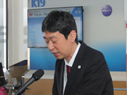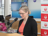 小山氏は、1983年に日系航空会社として初めてシカゴへ就航して以来、数々の困難を乗り越えながらJALを支えてくれた乗客の皆さまへの感謝の気持ちと、羽田・成田の二路線体制にかける強い決意を語りました。