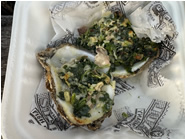 牡蠣の身にグラタンソースのようなものをのせて、殻ごとオーブンで焼いています。牡蠣の身は小さめですが、ソースに刻んだネギがたくさんのっているのであっさりと食べられます。
