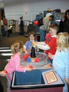 シカゴの町をベースに考えられたコーナーで、電車の先頭部分の模造がそのまま設置してあり、その前では線路を使って電車遊びが出来ます。シカゴの有名なタワーに代わって子供達が積み上げるおもちゃのタワー類や、磁石のプラス、マイナスで操るピンのコーナー等あります。 |