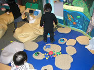 大きな迷路に入り、這ったり、歩いたりして何処へ行ったら出られるか、先を読み取り考える知恵を育てるコーナーです。迷路内では所々遊べる場所があり、触ると体温で色が変化する所、声をチューブに通して出してみたり、鏡に自分を映し出したりしつつ、出口を探し出します。 |