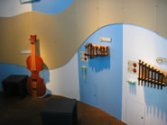 音楽を楽しむための実践コーナーで、どうやって音が出て音楽になるのかをみる事ができます。壁には大きなバイオリンが掛かり、その弦で音を出し、鉄筋で音をかなでたり出来ます。自分で作るオルゴール、ドラムを叩き、音楽好きのお子さんにはたまらないコーナーです。 |