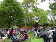 のお勧めは野外席でゆっくりとピクニックをしながら演奏を聞くことだと思います。ピクニックバスケットを広げてお友達や家族と食事や飲み物を楽しみながらの演奏会は格別で、こんなの日本ではなかなか味わえないのではないかと思います。回りを見回すと、テーブルに花瓶にはいったお花を飾り、ワイングラスでワインを飲みながら前菜やパスタなどを食しているカップルを見かけたり、二人で毛布にもぐりこんで寝そべりながら演奏を聴くカップルなど、皆さん楽しみ方もそれぞれ。確かに演出しだいではかなりロマンチックなデートスポットにもなると思います。