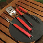 BBQグリルを購入したら、バーベキューに必要な専用の備品やお掃除道具もそろえましょう。これらはホーム・センターや雑貨小売店、アウトドア用品店などで購入できます。トングやスパチュラ、ベティー・ナイフは右の写真のようにセット売りされているものもあります。