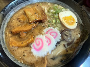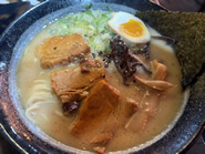 チャーシューの枚数が増えたグランド豚骨ラーメンは、ボリュームたっぷり 香ばしいガーリックの風味が広がるブラックガーリック入り豚骨ラーメンは味のインパクトを求める方にお勧め