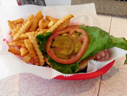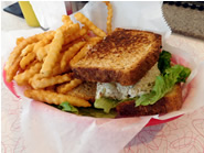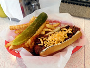グラス・フィードの牛肉を使ったバーガー。薄く潰し広げて焼いているので外側はカリッ、中はジューシー ツナサラダをたっぷり挟んだTuna Fish Salad Sandwich ビーフ・ソーセージの上に濃厚なチリをのせたChili Dogも人気メニューの1つ