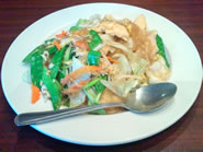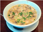 最初にオーダーしたTom Kha Kai Soupは、白いスープの中に鶏の胸肉やキノコ、グリーン・オニオンがたっぷり入っています。一口飲むとココナッツの濃厚なコクと甘さ、ライムの酸味、チリペッパーの辛味、それに生姜のようなスパイスが広がって、いかにもタイ!といったエキゾチックなハーモニーが楽しめます。ただ、砂糖を足したような甘みが後に残るのが惜しいところでした。