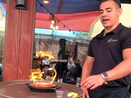 パイ生地にナッツやシナモンチョコを詰めて焼いたChoclavaとヤギのチーズを使ったGreek Manouri Cheesecake。 炎をあげた演出が気分を盛り上げてくれる、焼きチーズのサガナキもお勧め。 古びた造りの落ち着いた店内。