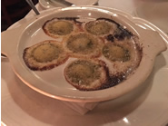 まずはオードブルに、大好物のエスカルゴとVol au Ventというシーフード料理を頼みました。ぐつぐつと煮立ったニンニクのきいたバターソースの中に入ったエスカルゴは、丸々と肉厚で、歯ごたえがあります。トーストはついてきませんが、テーブルサービスに白い紙袋に入った、焼きたてのフランスパンが出されるので、それをちぎってエスカルゴをのせたり、バターソースをたっぷりと浸して食べるのもお勧めです。エビと貝柱、それにザリガニをクリームソースで和えたVol au Ventは、ふっくらとしたパイがお皿の中央に添えられています。肝心の貝柱とエビにプリプリ感がないのは残念でしたが、バターとシーフードのうま味が濃縮された濃厚なソースは絶品。また、サクサクとしたパイと一緒に食べるとリッチ感が増すのでお勧めです。