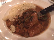 メインには鶏肉料理のPoulet Forestiereと仔牛肉を使ったVeau Cordon Bleuを頼みました。Poulet Forestiereは鶏の胸肉とマッシュルームをマディエラワインとクリームで煮たお料理で、サイドにはゴートチーズとチャイブ入りのマッシュポテトを添えています。鶏胸肉はしっとりとしていて、マッシュルームも生の風味を残したシャキシャキ感がよく、濃厚なソースの中でも素材の味わいが活きています。綺麗に絞り出しされたマッシュポテトも、チーズとハーブが味のヒントになっていて、飽きの来ない味わい。Veau Cordon Bleuは叩いて平たくした子牛肉にエメンタールチーズとハムをミルフィールのように重ねて、油とバターで揚げ焼きにしたもので、こちらもサイドにはマッシュルームとマディエラワインのソースがかかっています。ナイフを入れると、中からエメンタールチーズがらとろけ出てきて、塩味のきいたハムと子牛肉をソースに絡めて食べると、思わず笑みがこぼれてしまう一品です。