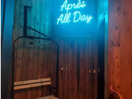 「アスペンやレイクタホまで行かなくても、シカゴでスキーリゾート気分を味わえる!」をコンセプトにした「Chalet」をご紹介します。こちらのお店は2021年10月1日に出来たばかりの新しいレストランで、グルメなアメリカンフードとお洒落なオリジナル・カクテルを、素敵なロッジ風の店内で堪能できます。ダークブルーのレンガ壁で造られたモダンな佇まいのお店は、雪山のロゴマークが目印です。山小屋のような温かみのある店内にもレンガ壁が使われており、そこにもダイナミックな雪山のイラストが描かれています。また店内のテレビ画面にはスキーの映像が流れ、壁や照明にも雪とスキーをテーマにした装飾品が使われており、トイレ前の一角はスキーリフトのベンチや、レトロなスキー板やポールが飾られた素敵な写真スポットになもなっています!ちなみにトイレ内もスキーの写真が一面に貼られており、どこもかしこもスキー一色でした。今回は1階のダイニングで食事をしましたが、2階席もありそちらはイベント用などに貸し切りすることが可能だそうです。予約はオンラインからも出来ます。