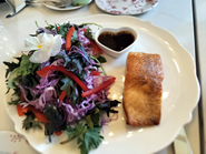 まずは前菜に「Kale Salad」を頼みました。緑のアルグラに赤パプリカや紫キャベツ、白い食用花が散りばめられた、美しい彩りのサラダです。ハート型の可愛らしい容器に入ったピーチ風味のバルサミコ酢ドレッシングをかけて、こんがりとグリルされた肉厚で柔らかいサーモンとともにいただきます。