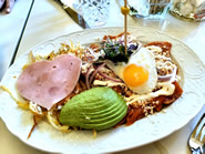 彩り美しいKale Saladはこんがりとグリルされた肉厚で柔らかいサーモンが添えられています サルサソースを絡めたトルティアに、ハッシュドブラウン、目玉焼き、ハムをのせたChilaquiles add Avocado