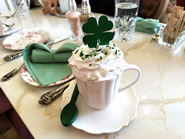 デザートには、全10種類の魅力的なラインナップから「Coquette Crepe」を選びました。しっとりとしたクレープ生地に、甘いコンデンスミルクとホイップクリームを挟み、トップにはバニラアイスをトッピング。仕上げにピンクの粉糖をふりかけ、ピンクのリボン付きスティックが飾られた、とてもガーリーでフォトジェニックな一皿です。ドリンクに選んだ「Cappuccino」は、きめ細かなふわふわのミルクフォームがのっており、コーヒーのほろ苦さとミルクのやさしい甘さが絶妙なハーモニーを生み出します。取材時はセントパトリックデーが近かったこともあり、ソーサーにはそれににちなんだ緑色のクッキーが添えられていました。「Hot Chocolate」は濃厚なチョコレートドリンクにたっぷりのホイップクリームがのり、緑のスプリンクルやクローバー型の飾りが華を添えます。さらに、ソーサーには緑色のチョコレート・スプーンが添えられ、ドリンクからも細部へのこだわりが感じられます。