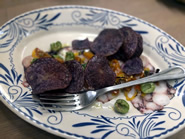 コーンの自然な甘さにアレッポペッパーのスパイス、黒ライムの香りがバランスよく重なる、人気のSweetcorn Hummus ハマチと炙ったアボカドのスモーキーな風味が印象的なHamachi & Charred Avocado Octopus Carpaccioは薄くスライスしたタコにマリネしたスイートペッパー、アプリコットハニー、パープルポテトクリスプが添えてあります
