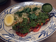 メインの「Grilled Oishii Shrimp Kebab」は、香ばしく焼き上げられた大ぶりのエビが主役。しっかりとした旨味と食べ応えがあり、そのままでも十分に美味しくいただけますが、ズーグ(中東風のスパイシーハーブソース)やレモンを合わせることで、さっぱりとした味の変化も楽しめます。バスマティライスとの相性も良く、さまざまな食べ方ができる満足度の高い一皿でした。海鮮メニューの中でも特に人気があり、エビ好きにはぜひおすすめしたいメイン料理です。肉料理に選んだ「Chicken Kefta」は、スパイスとハーブを練り込んだひき肉を串焼きにした中東風のケバブ。ヨーグルトときゅうり、ディルを合わせたザジキソースとともに、さっぱりといただけます。どの料理も素材の持ち味を最大限に引き出しており、一品一品が印象に残る仕上がり。最後まで飽きることなく楽しめる、完成度の高い食体験でした。